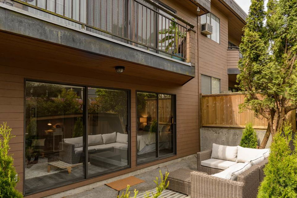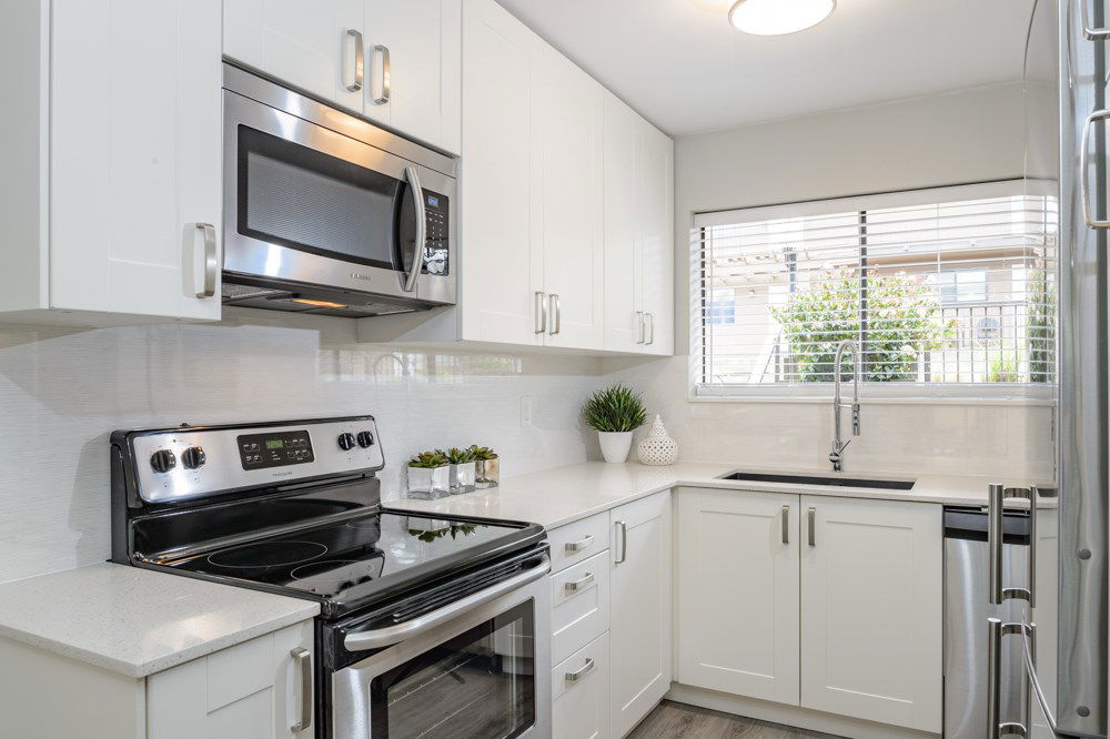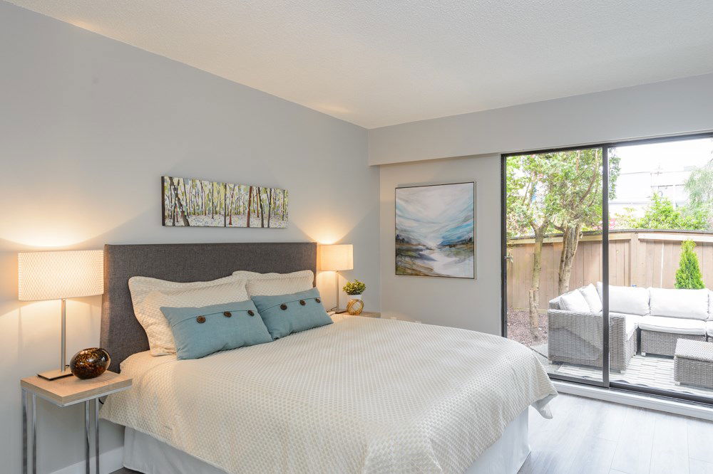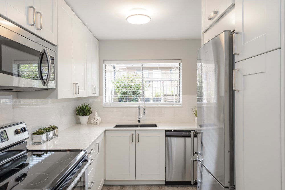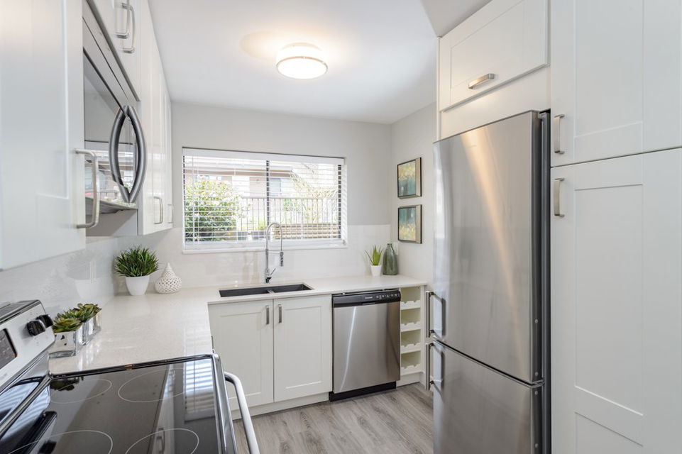 This is a 10/10. Beautifully remodeled 2 BR condo with a lovely outdoor private, fenced ground floor patio space. Completely renovated with city permits. New kitchen, bathroom, appliances, paint, Laminate floors etc. In suite washer and dryer. Open kitchen, private exterior entrance from central courtyard for a Townhouse feel. Proactive WELL managed complex with recent re-roofing/re-plumbing! Central location. Steps to BUS, Grocery Store, Shopping, Restaurants, School and More! Low maintenance fee. RENTALS ALLOWED. Cat OK no dogs. CHECK OUT 3D TOUR http://rem.ax/2r79QTE