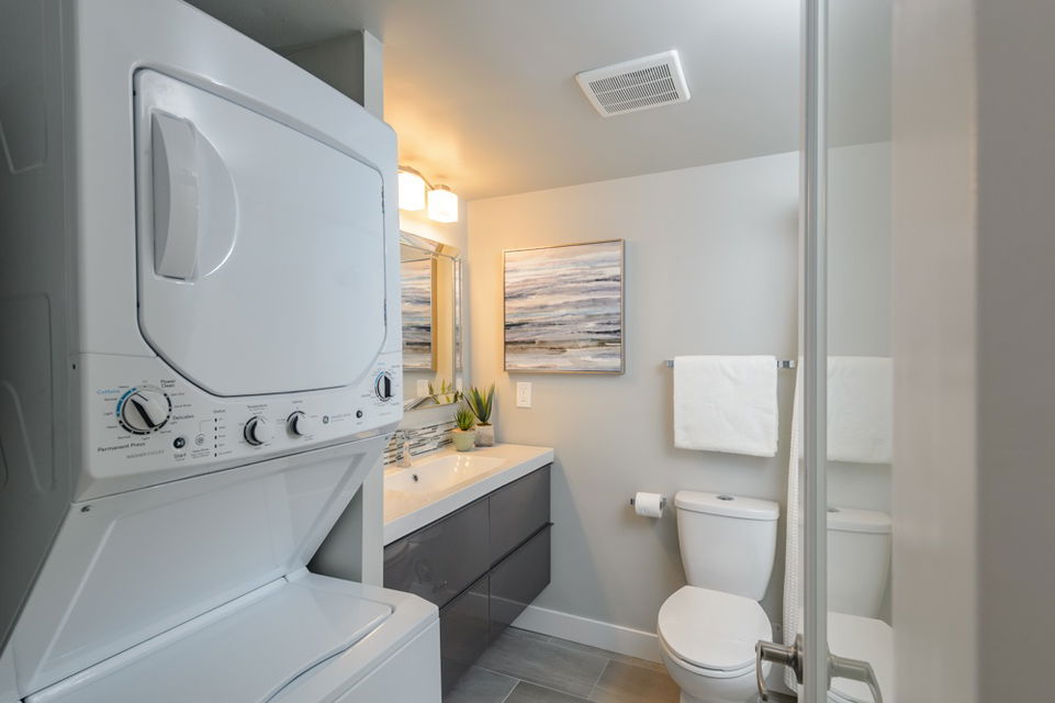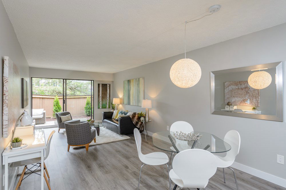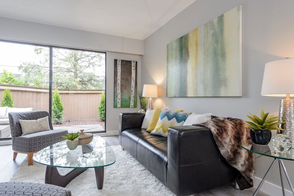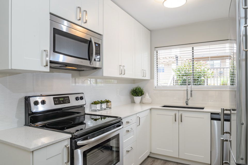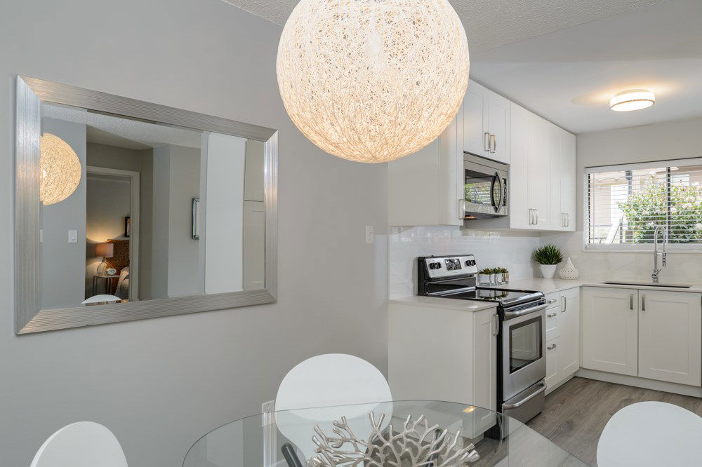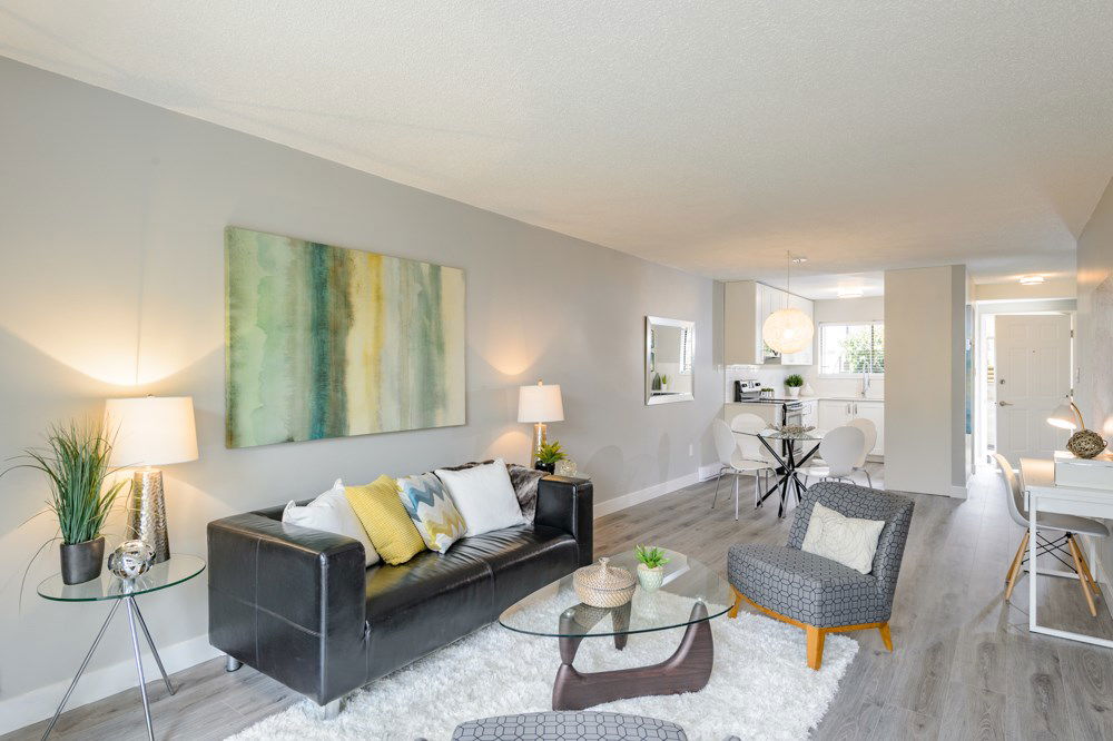 This is a 10/10. Beautifully remodeled 2 BR condo with a lovely outdoor private, fenced ground floor patio space. Completely renovated with city permits. New kitchen, bathroom, appliances, paint, Laminate floors etc. In suite washer and dryer. Open kitchen, private exterior entrance from central courtyard for a Townhouse feel. Proactive WELL managed complex with recent re-roofing/re-plumbing! Central location. Steps to BUS, Grocery Store, Shopping, Restaurants, School and More! Low maintenance fee. RENTALS ALLOWED. Cat OK no dogs. CHECK OUT 3D TOUR http://rem.ax/2r79QTE