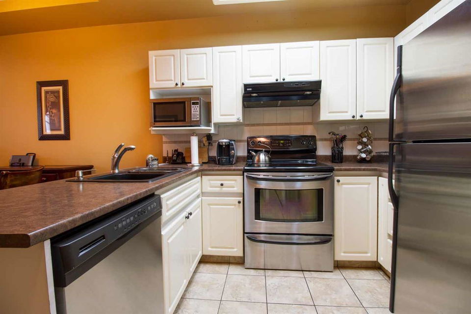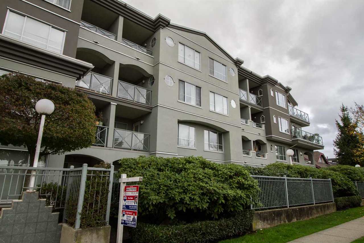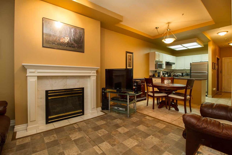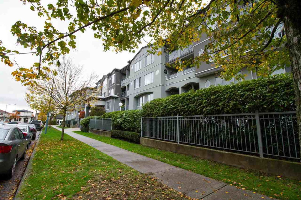 1 BR home facing West, w/private deck area facing a nice green belt. This home is beautifully updated with newer stainless steel appliances, counters, lights, paint etc. shows very well. Nice gas fireplace. High quality washer & dryer, lots of storage in the suite. High ceilings give a spacious feel to this open floor plan condo. Hot water heat inlc in maintenance fee. Well run rainscreened building. 1 pet 5kg max ok, rentals at max. Building has common room, extra large bike room & extra large storage locker, 1 parking incl as well. Central location at 49th & Fraser, so close to everything. 3D TOUR LINK goo.gl/khBcA2
