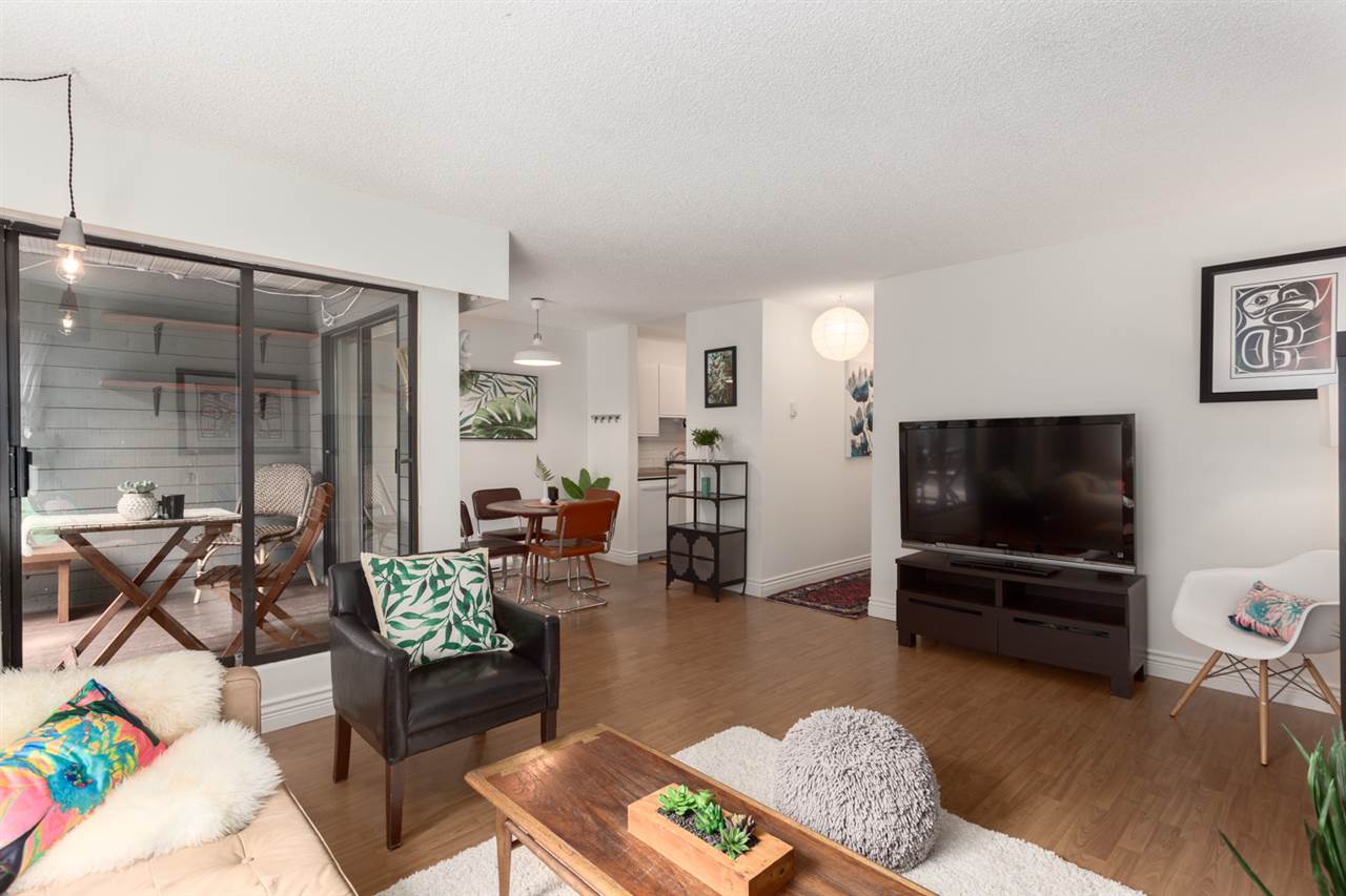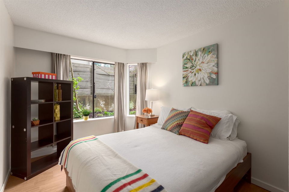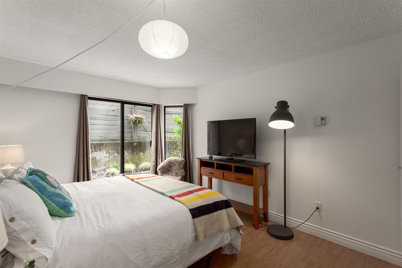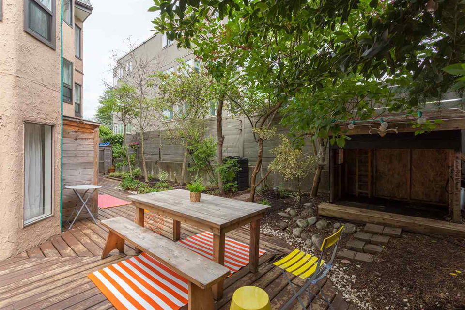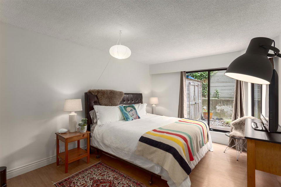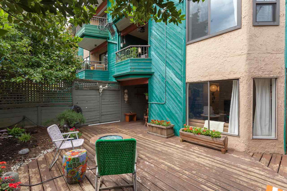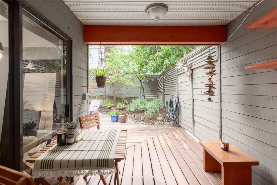 GARDEN OASIS BY THE SEA! On a quiet block, in a friendly building, this spacious corner-unit has nice light from large windows & southeastern exposure. Updated bath with ensuite access to the large master bedroom with walk-thru closet & out to patio through sliding glass doors. The large living & dining area have lovely garden outlooks & direct access to the incredible 1644 sqft private wraparound sundeck/yard – excellent for kids, pets & green thumbs alike! Good closet space throughout, shared laundry, 3 garden sheds, 1 locker & 1 parking. 1 pet & 3 rentals allowed (@ 2 now). Fantastic access to waterfront parks with stunning ocean/mountain/port vistas, market groceries, a blooming brewery district, good schools & transit downtown. Be part of a trendy community with a bright future!