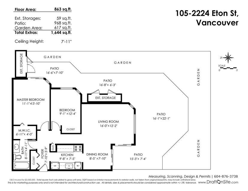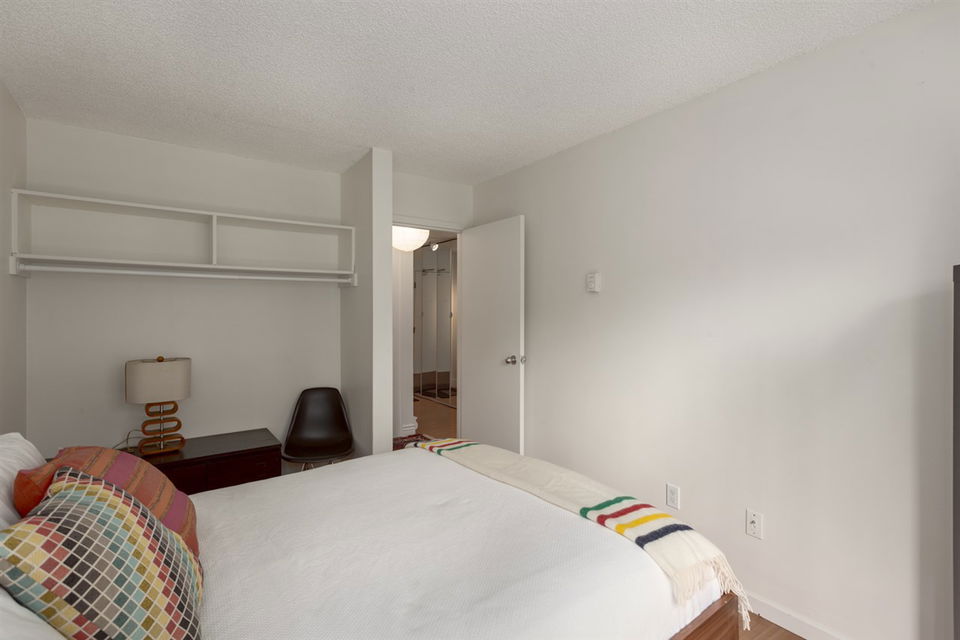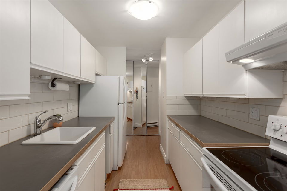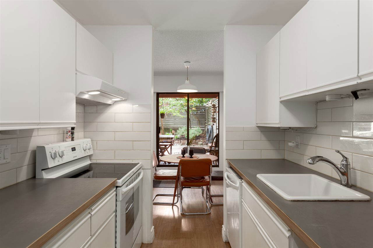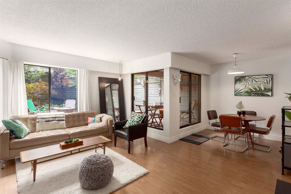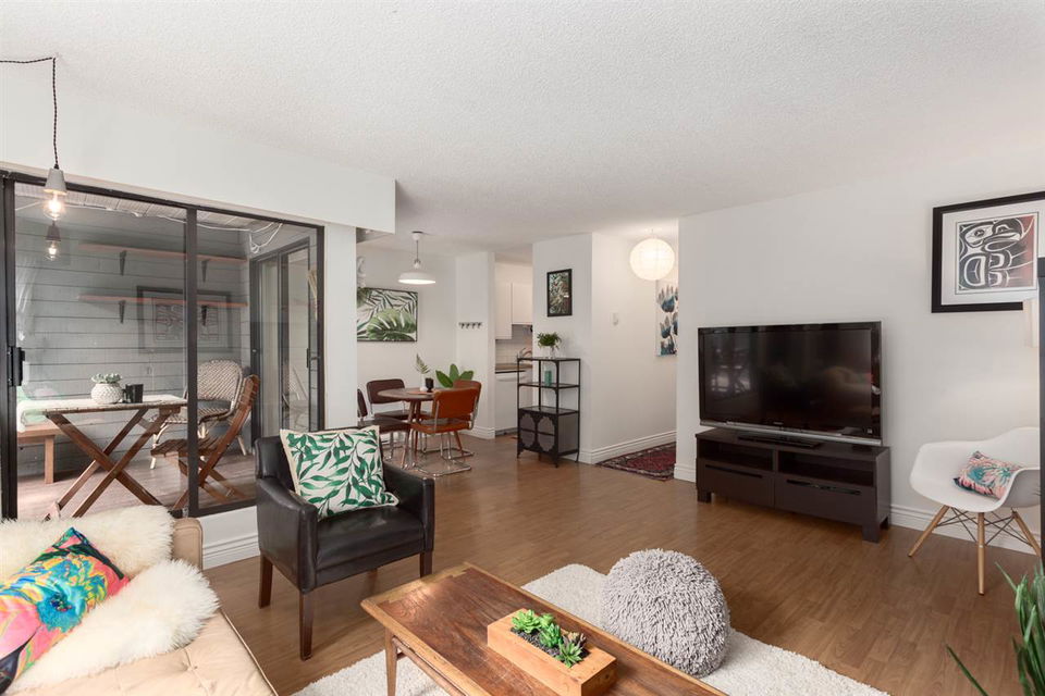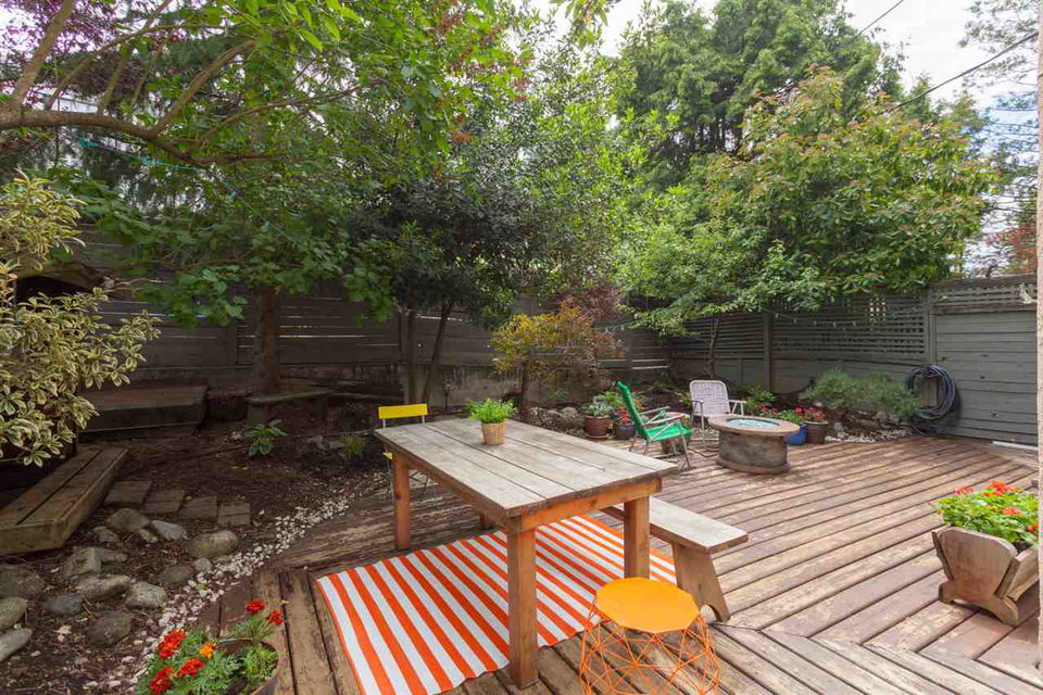 GARDEN OASIS BY THE SEA! On a quiet block, in a friendly building, this spacious corner-unit has nice light from large windows & southeastern exposure. Updated bath with ensuite access to the large master bedroom with walk-thru closet & out to patio through sliding glass doors. The large living & dining area have lovely garden outlooks & direct access to the incredible 1644 sqft private wraparound sundeck/yard – excellent for kids, pets & green thumbs alike! Good closet space throughout, shared laundry, 3 garden sheds, 1 locker & 1 parking. 1 pet & 3 rentals allowed (@ 2 now). Fantastic access to waterfront parks with stunning ocean/mountain/port vistas, market groceries, a blooming brewery district, good schools & transit downtown. Be part of a trendy community with a bright future!