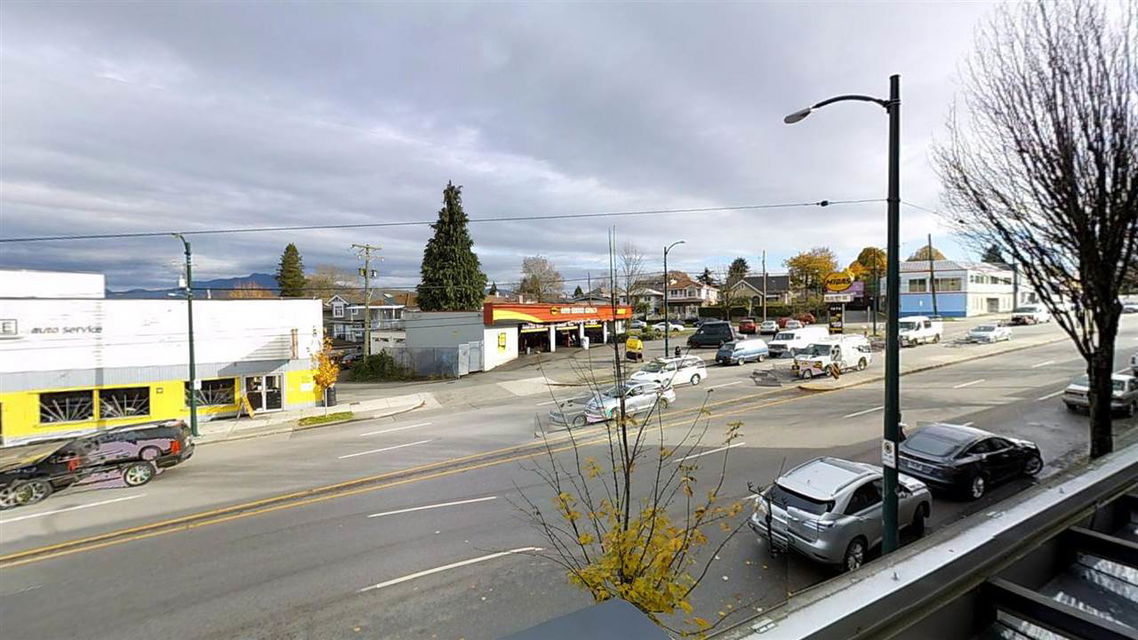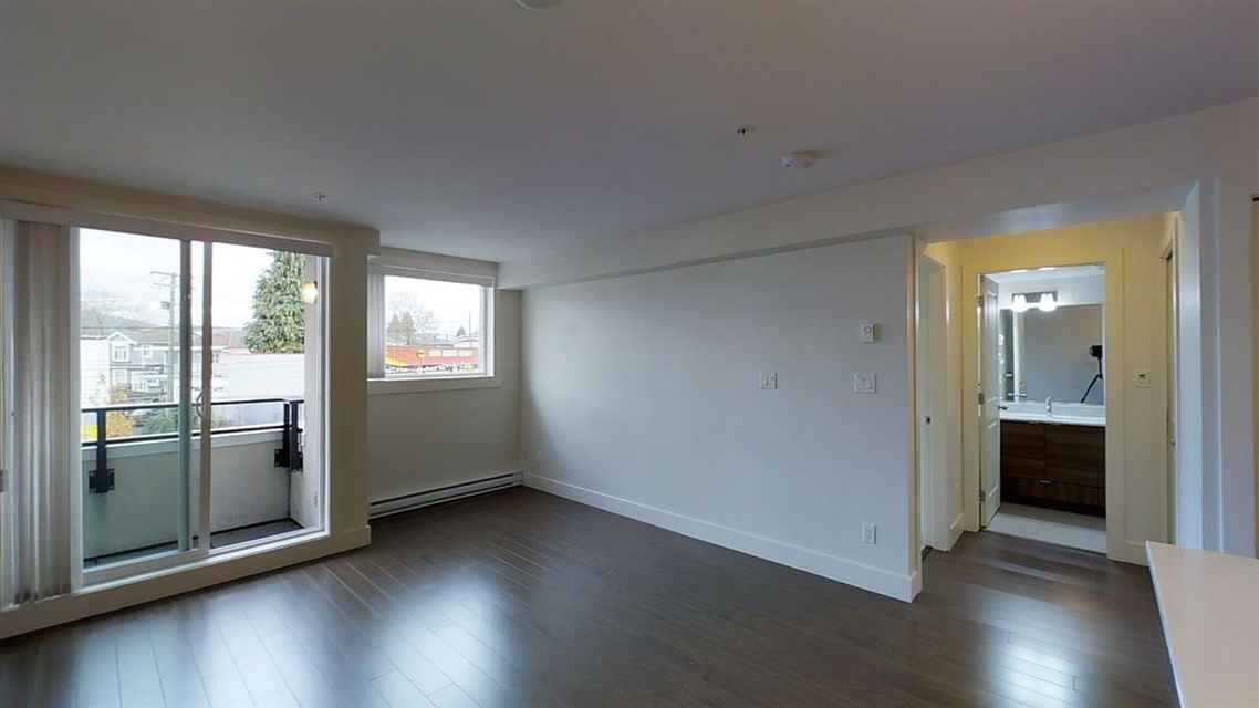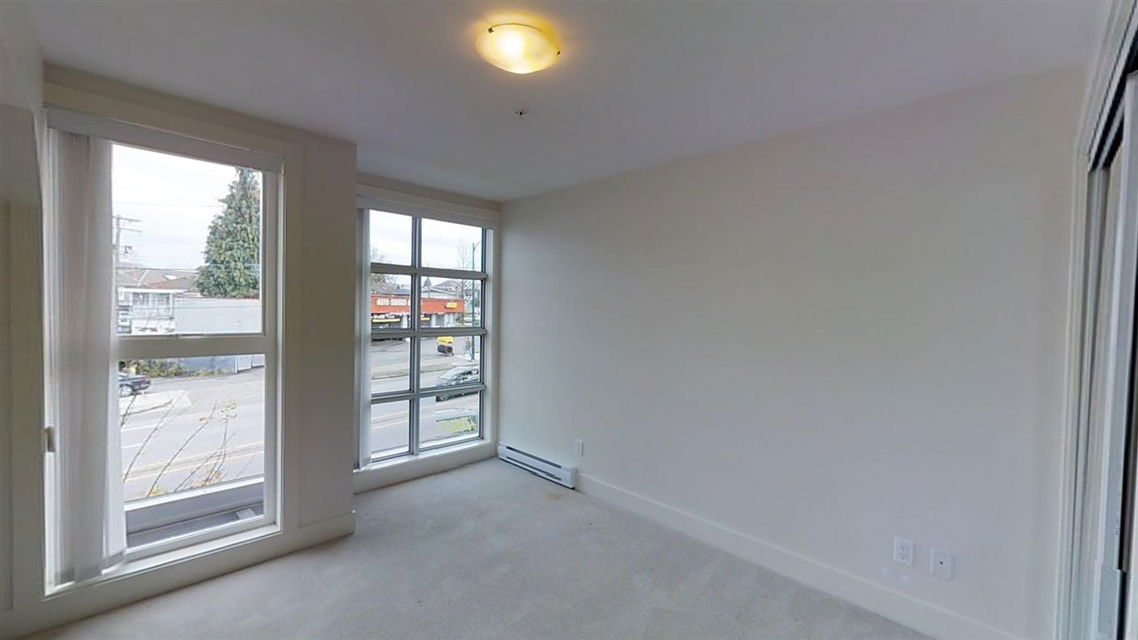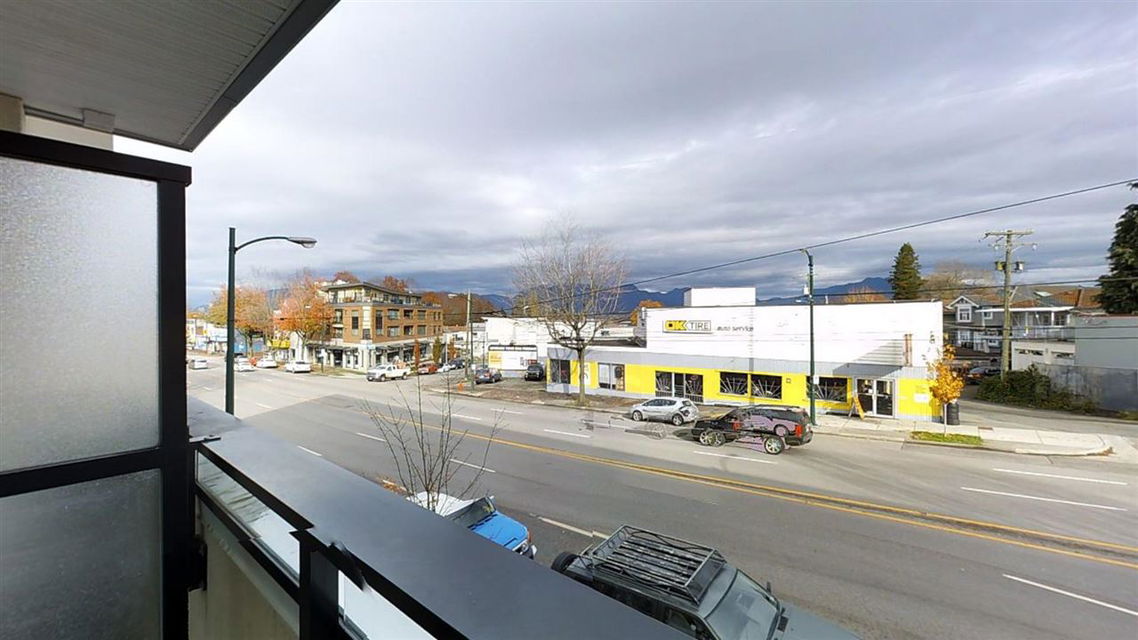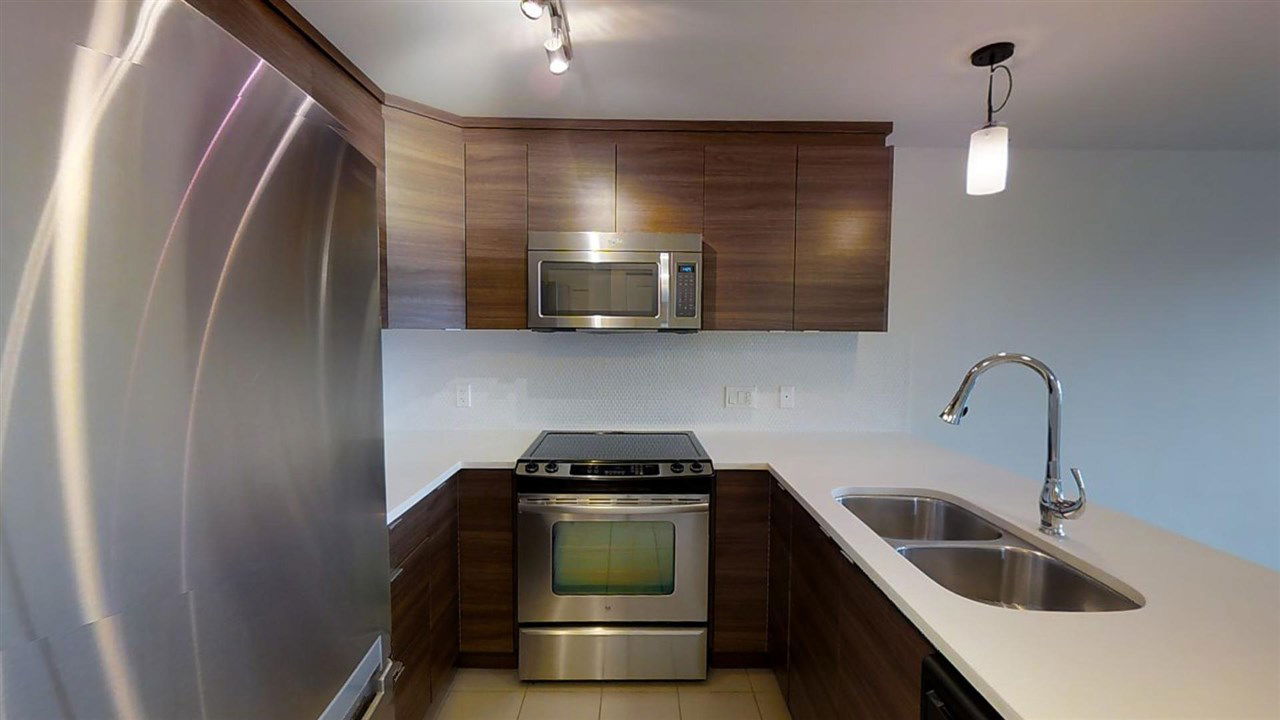 1 BR & Den facing north w/ limited mountain view, open layout, this home is conveniently located at the corner of Kingsway & Commercial. You are in the middle of everything, so very convenient to shopping, transit, Nanaimo skytrain, restaurants etc. This home has a small balcony overlooking Kingsway. Home is extra clean, like a brand new place. Spa like bathroom is luxurious, floor to ceiling windows for lots of natural light, high end stainless steel appl, quartz like countertops, washer & dryer, large bike room & a locker, (sorry no parking). Great investment or 1st home. Rentals limited to 9, 1 pet any size OK. 3D TOUR LINK – goo.gl/zMQl0z